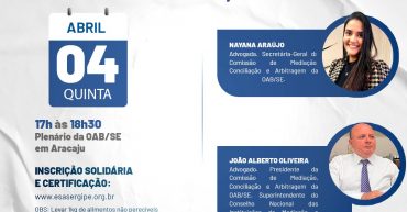 Data: Quinta, 04 de abril Horário: 17h às 18h30 Local: Plenário da Ordem Av. Ivo do Prado, 1072 – São José, Aracaju INSCRIÇÃO SOLIDÁRIA: OBS: Levar 1kg de alimento não perecível Limite de vagas: 70 pessoas Carga Horária: 1h30 Público-alvo: Advogados, estagiários, estudantes de Direito e sociedade em geral. Palestrantes: Nayana Araújo – Advogada. Secretária-Geral […]