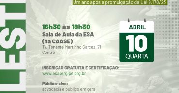 Data: Quarta, 10 de abril Horário: 16h30 às 18h30 Local: Sala de Aula da ESA Sergipe Rua Tenente Martinho Garcez, 71 – Centro, Aracaju Limite de vagas: 60 pessoas Carga Horária: 2 horas Público-alvo: Advogados e sociedade em geral. PROGRAMAÇÃO Painel 1 – 16h40 às 17h10 Tema – Cannabis Medicinal: a história dessa terapia Palestrante: […]