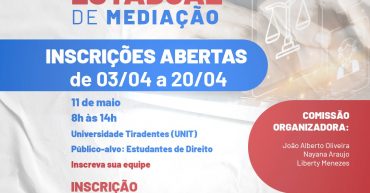 Data: Sábado, 11 de maio Horário: 8h às 14h Local: Universidade Tiradentes (UNIT) Período de inscrições: 03/04 a 20/04 Limite de vagas: 50 pessoas Carga Horária: 6h Público-alvo: Estudantes de Direito Comissão organizadora: João Alberto Oliveira Nayana Araujo Liberty Menezes Realização: OAB SERGIPE – ESA SERGIPE – COMISSÃO DE CONCILIAÇÃO, MEDIAÇÃO E ARBITRAGEM Apoio: NUPEMEC […]