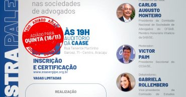 Data: Quinta, 16 de novembro Horário: 19h Local: Auditório da CAASE Rua Tenente Martinho Garcez, 71 – Centro, Aracaju INSCRIÇÕES GRATUITAS E CERTIFICAÇÃO www.esasergipe.org.br Carga Horária: 4h Palestrante: Gustavo Brigagão – Presidente Nacional do CESA. Sócio da Brigagão, Duque Estrada Advogados. Presidente da Mesa: Carlos Augusto Monteiro – Presidente da Comissão Nacional de Sociedade de […]