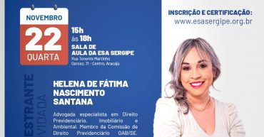 Data: quarta-feira, 22 de novembro de 2023 Horário: 15h às 18h Local: sala de Aula da ESA Sergipe Rua Tenente Martinho Garcez, 71 – Centro, Aracaju INSCRIÇÃO: ww.esasergipe.org.br Certificação: ESA Público-alvo: advocacia previdenciarista de Sergipe Palestrante Convidada: HELENA DE FÁTIMA NASCIMENTO SANTANA – Advogada especialista em Direito Previdenciário, Imobiliário e Ambiental. Membro da Comissão de […]