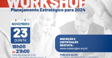 Data: quinta-feira, 23 de novembro Horário: 18h às 21h Local: sala de Aula da ESA Rua Tenente Martinho Garcez, 71 – Centro, Aracaju Inscrição: ww.esasergipe.org.br Certificação: ww.esasergipe.org.br Público-alvo: Advogadas e advogados sócios ou aspirantes a sócios de escritórios de advocacia, estagiários e estudantes de direito. Palestrante: GIDELZO FONTES – Conselheiro Seccional da OAB/SE. Presidente da […]