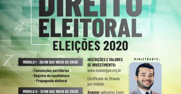 INSCRIÇÃO ESPECÍFICA PARA O MÓDULO I – TURMA II CURSO PRÁTICO DIREITO ELEITORAL: ELEIÇÕES 2020 – MÓDULO I – TURMA II – ONLINE DATA: 20/08/2020 HORÁRIO: 18:30 ÀS 21:30 CERTIFICAÇÃO: 03 HORAS VAGAS LIMITADAS: 100 VAGAS MINISTRANTE: WESLEY CARDOSO – MEMBRO DA COMISSÃO DE DIREITO ELEITORAL DA OAB/SE CONTEÚDO PROGRAMÁTICO: – CONVENÇÕES PARTIDÁRIAS – REGISTRO DE CANDIDATURA – […]