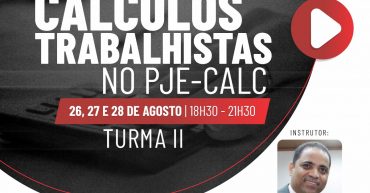 CURSO PRÁTICO DE CÁLCULOS TRABALHISTAS NO PJE-CALC – TURMA II (telepresencial e ao vivo) DATA: 26, 27 e 28 de agosto de 2020 HORÁRIO: 18:30h às 21:30h CERTIFICAÇÃO: 10 horas TURMA LIMITADA A 25 VAGAS ACESSO: APLICATIVO ZOOM MINISTRANTE: Walter Quintela – Gestor Regional do PJe-Calc no TRT20ª CONTEÚDO PROGRAMÁTICO: AULA 01: Noções básicas aos […]