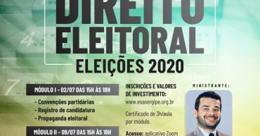 INSCRIÇÃO ESPECÍFICA PARA O MÓDULO I CURSO PRÁTICO DIREITO ELEITORAL: ELEIÇÕES 2020 – MÓDULO I – ONLINE DATA: 02/07/2020 HORÁRIO: 15H ÀS 18H ACESSO: APLICATIVO ZOOM CERTIFICAÇÃO: 03 HORAS VAGAS LIMITADAS: 100 VAGAS MINISTRANTE: WESLEY CARDOSO – MEMBRO DA COMISSÃO DE DIREITO ELEITORAL DA OAB/SE CONTEÚDO PROGRAMÁTICO: – CONVENÇÕES PARTIDÁRIAS – REGISTRO DE CANDIDATURA – […]