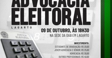 CURSO PRÁTICO DE INICIAÇÃO À ADVOCACIA ELEITORAL – REGIONAL LAGARTO DATA: 09/10/2019 HORÁRIO: 18:30H ÀS 21:30H LOCAL: SEDE DA OAB EM LAGARTO INSCRIÇÃO: ESTUDANTE DE GRADUAÇÃO: R$ 20,00 / ADVOCACIA: R$ 30,00 / JOVEM ADVOCACIA (até 5 anos de inscrição): R$ 25,00 / OUTROS PROFISSIONAIS: R$ 40,00 / ADVOCACIA SÊNIOR (mais de 60 anos de […]