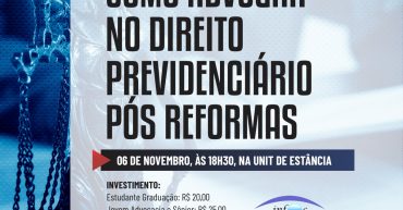 CURSO: COMO ADVOGAR NO DIREITO PREVIDENCIÁRIO APÓS AS REFORMAS – REGIONAL ESTÂNCIA DATA / HORÁRIO / LOCAL 06/11 – 18:30 às 22:00 – Estância – UNIT MINISTRANTES: • Professora Juliana Ribeiro – Doutoranda em Ciências Jurídicas pela Universidade Autónoma de Lisboa/PT; Mestre em Direito Previdenciário pela PUC-SP; Advogada; Coordenadora e professora de cursos de Pós-graduação […]
