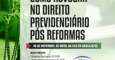 CURSO: COMO ADVOGAR NO DIREITO PREVIDENCIÁRIO APÓS AS REFORMAS DATA / HORÁRIO / LOCAL 05/11 – 18:30 às 22:00 – Aracaju/SE – Sala de Aula da ESA MINISTRANTES: • Professora Juliana Ribeiro – Doutoranda em Ciências Jurídicas pela Universidade Autónoma de Lisboa/PT; Mestre em Direito Previdenciário pela PUC-SP; Advogada; Coordenadora e professora de cursos de […]