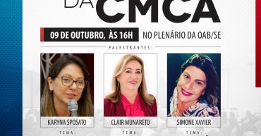 OFICINA DA CMCA DATA: 09/10/2019 HORÁRIO: 16:00 às 18:00 LOCAL: PLENÁRIO DA OAB/SE ENTRADA FRANCA PALESTRANTES: * KARYNA SPOSATO – JUSTIÇA JUVENIL RESTAURATIVA * CLAIR MUNARETO – UMA NOVA ESCOLA A PARTIR DA MEDIAÇÃO DO CONFLITO ESCOLAR * SIMONE XAVIER – COMUNICAÇÃO NÃO VIOLENTA NAS ESCOLAS