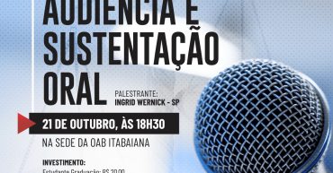 OFICINA: ESTRATÉGIAS DE PREPARAÇÃO PARA AUDIÊNCIA E SUSTENÇÃO ORAL – REGIONAL ITABAIANA Professora: Ingrid Wernick Realização: ESA e COMISSÃO REGIONAL DE ITABAIANA Data inicial: 21/10/2019 Data final: 21/10/2019 Horários: 18H:30MIN Local onde ocorrerá o evento: Sede da OAB em Itabaiana Ementa: Comunicação assertiva na advocacia Conhecendo o sistema representacional e sua aplicação na preparação da […]
