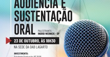 OFICINA: ESTRATÉGIAS DE PREPARAÇÃO PARA AUDIÊNCIA E SUSTENÇÃO ORAL – REGIONAL LAGARTO Professora: Ingrid Wernick – SP Realização: ESA e COMISSÃO REGIONAL DE LAGARTO Data inicial: 23/10/2019 Data final: 23/10/2019 Horários: 18H:30MIN Local onde ocorrerá o evento: SEDE DA OAB/LAGARTO Ementa: Comunicação assertiva na advocacia Conhecendo o sistema representacional e sua aplicação na preparação da […]