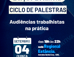 Data: Quinta-feira, 04/09 Horário: 19h às 22h Local: Sede Regional Estância. Endereço: Avenida Santa Cruz, 1395, Bairro Santa Cruz, Estância/SE Público-alvo: advocacia em geral, estudantes, estagiários de Direito. VAGAS LIMITADAS INSCRIÇÕES: https://www.esasergipe.org.br PALESTRANTE: Dayse Coelho de Almeida – Advogada trabalhista. Presidente da Associação Sergipana de Advogados Trabalhistas. Mestre em Direito do Trabalho pela Pontifícia Universidade […]