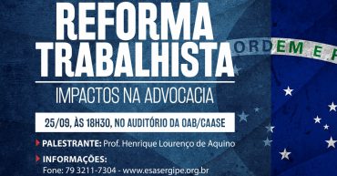 PALESTRA IMPACTOS DA REFORMA NA PRÁTICA DA ADVOCACIA TRABALHISTA E SEUS REFLEXOS NO DIREITO PREVIDENCIÁRIO DATA: 25/09/2017 HORÁRIO: 18:30H AS 21:30H CARGA HORÁRIA COM CERTIFICADO:03H LOCAL: AUDITÓRIO DA CAASE Objetivo: Permitir ao Advogado se atualizar na área do Direito do Trabalho frente a Reforma Trabalhista (Lei 13.467/17), através de uma abordagem Prática sobre os temas […]
